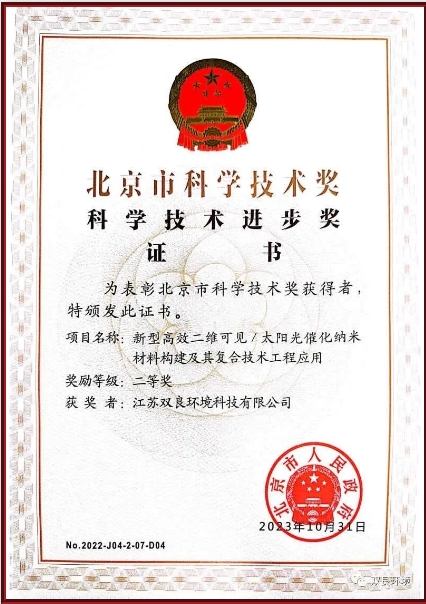 近日,江蘇雙良環(huán)境科技有限公司參與的項(xiàng)目《新型高效二維可見(jiàn)/光催化納米材料構(gòu)建及其復(fù)合技術(shù)工程應(yīng)用》榮獲北京市科學(xué)技術(shù)進(jìn)步獎(jiǎng)二等獎(jiǎng)。