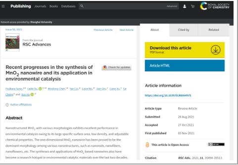 03介紹:2021年11月,南京信息工程大學(xué)、南京林業(yè)大學(xué)、濟(jì)南大學(xué)與江蘇雙良環(huán)境科技有限公司在《Royal Society of Chemistry》期刊上發(fā)表“Recent progresses in the synthesis of MnO2 nanowire and its application in environmental catalysis”一文。3Jd新型光催化網(wǎng)_水庫治理_河道治理_水生態(tài)修復(fù)_水環(huán)境治理與修復(fù)_江蘇雙良環(huán)境科技有限公司