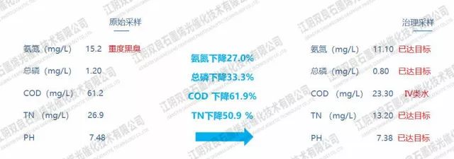 治理后已消除黑臭,并且水質指標已接近Ⅳ類水。gaP新型光催化網(wǎng)_水庫治理_河道治理_水生態(tài)修復_水環(huán)境治理與修復_江蘇雙良環(huán)境科技有限公司