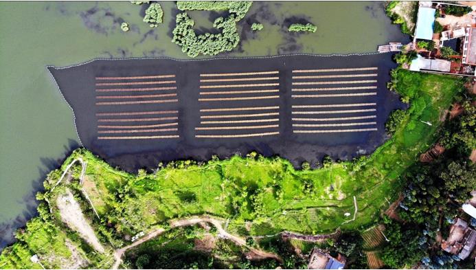 同年4月,云南省大理州洱源縣西湖新型光催化技術水質提升示范研究項目開始進入全面施工階段。首先,采用柔性圍隔分離出11500㎡的水域,減少內外水體交換。在水下約十公分處敷設水域占比面積為31.7%的光催化網,它是一種將多種納米級光催化材料和石墨烯強化材料相結合的新型光催化材料,負載于具有超高比表面積的PP纖維絲的新型水環(huán)境生態(tài)治理設備,與水體充分接觸,能高效吸收太陽光,利用光催化氧化作用無選擇降解水中有機污染物,提升水體透明度,改善水體生境,引導水生態(tài)自組織修復,抑制藍藻水華發(fā)生。隨著水中微生物、底棲動物、浮游藻類、沉水植物以及魚類的逐步恢復,水生態(tài)系統(tǒng)區(qū)域健全,從而進一步使水質得到提升,最終形成水生態(tài)-水質提升的良性循環(huán)體系。用時1個月,項目全面竣工并正式開始后期運營維護工作,確保治理水體生態(tài)系統(tǒng)運行良好,水質持續(xù)保持并提升。Elg新型光催化網_水庫治理_河道治理_水生態(tài)修復_水環(huán)境治理與修復_江蘇雙良環(huán)境科技有限公司