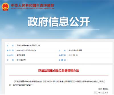 為了加強(qiáng)對環(huán)境監(jiān)管重點單位的監(jiān)督管理,強(qiáng)化精準(zhǔn)治污,根據(jù)《中華人民共和國環(huán)境保護(hù)法》和水、大氣、噪聲、土壤等污染防治法律,以及地下水管理、排污許可管理等行政法規(guī),制定本辦法。《環(huán)境監(jiān)管重點單位名錄管理辦法》已于2022年8月15日由生態(tài)環(huán)境部2022年第四次部務(wù)會議審議通過,現(xiàn)予公布,自2023年1月1日起施行。