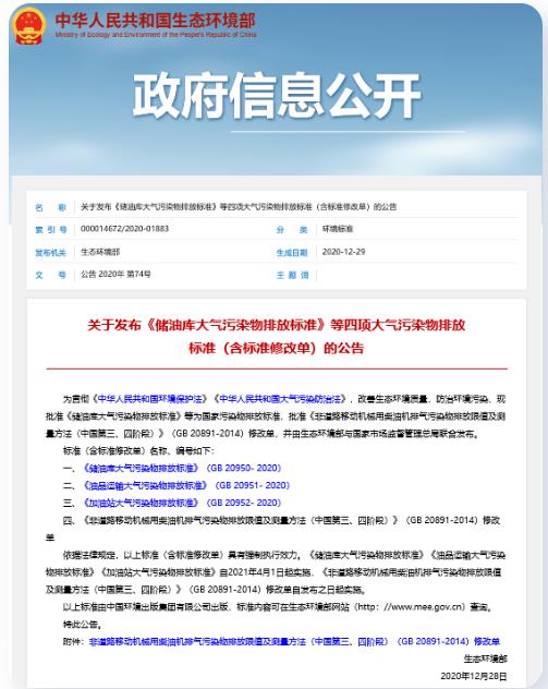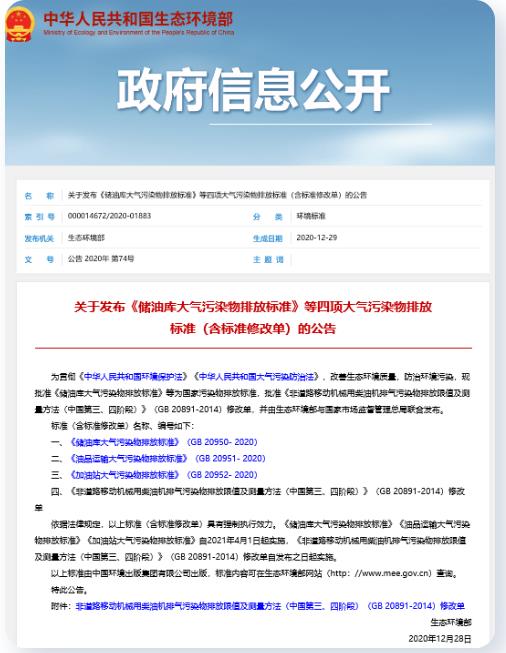 為貫徹《中華人民共和國(guó)環(huán)境保護(hù)法》《中華人民共和國(guó)大氣污染防治法》,防治環(huán)境污染,改善環(huán)境質(zhì)量,環(huán)境部印發(fā)《儲(chǔ)油庫(kù)大氣污染物排放標(biāo)準(zhǔn)》(GB 20950- 2020)。本標(biāo)準(zhǔn)規(guī)定了儲(chǔ)油庫(kù)儲(chǔ)存、收發(fā)油品過(guò)程中油氣排放控制要求、監(jiān)測(cè)和監(jiān)督管理要求,自2021年4月1日起實(shí)施。rk4新型光催化網(wǎng)_水庫(kù)治理_河道治理_水生態(tài)修復(fù)_水環(huán)境治理與修復(fù)_江蘇雙良環(huán)境科技有限公司