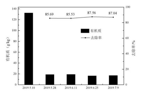 由圖可以看出經(jīng)過治理后,底泥中有機(jī)質(zhì)的含量大幅度減少,到2019年7月9日,平均去除率達(dá)到87.04%。lX2新型光催化網(wǎng)_水庫治理_河道治理_水生態(tài)修復(fù)_水環(huán)境治理與修復(fù)_江蘇雙良環(huán)境科技有限公司