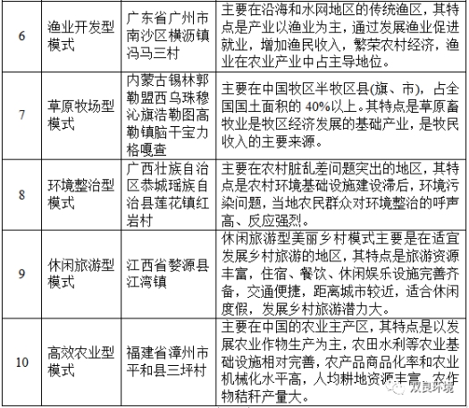 國(guó)家農(nóng)業(yè)部于2013年啟動(dòng)了“美麗鄉(xiāng)村”創(chuàng)建活動(dòng),于2014年2月正式對(duì)外發(fā)布美麗鄉(xiāng)村建設(shè)十大模式,為全國(guó)的美麗鄉(xiāng)村建設(shè)提供范本和借鑒。具體而言這十大模式分別為:產(chǎn)業(yè)發(fā)展型、生態(tài)保護(hù)型、城郊集約型、社會(huì)綜治型、文化傳承型、漁業(yè)開(kāi)發(fā)型、草原牧場(chǎng)型、環(huán)境整治型、休閑旅游型、高效農(nóng)業(yè)型。