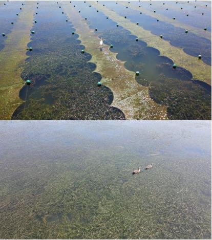 ▲治理區(qū)航拍下自然生長的水下森林Dxk新型光催化網(wǎng)_水庫治理_河道治理_水生態(tài)修復(fù)_水環(huán)境治理與修復(fù)_江蘇雙良環(huán)境科技有限公司