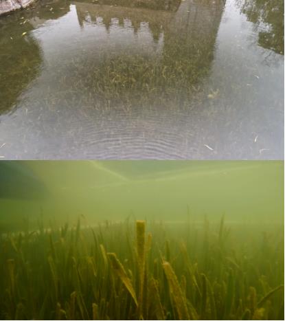 ▲治理區(qū)水體通透,水下水草茂盛Dxk新型光催化網(wǎng)_水庫治理_河道治理_水生態(tài)修復(fù)_水環(huán)境治理與修復(fù)_江蘇雙良環(huán)境科技有限公司