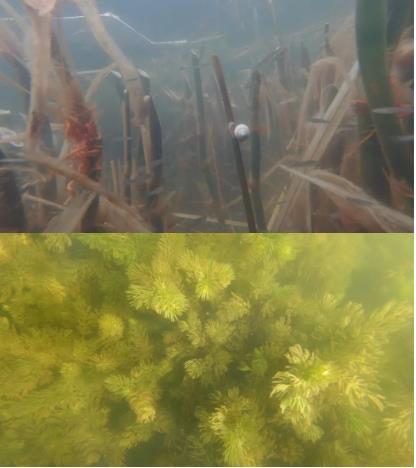 ▲治理區(qū)自然生長的狐尾藻、蘿卜螺Dxk新型光催化網(wǎng)_水庫治理_河道治理_水生態(tài)修復(fù)_水環(huán)境治理與修復(fù)_江蘇雙良環(huán)境科技有限公司