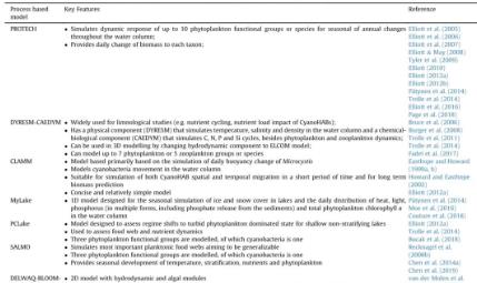 在SLR中確定了幾個(gè)湖泊的單個(gè)PB模型,或?qū)iT(mén)為單個(gè)湖泊開(kāi)發(fā)的其他模型,并側(cè)重于主要的環(huán)境或生理因素。一些著名的模型如PROTECH、DYRESM-CAEDYM、CLAMM、MyLake、PCLake、SALMO、SALMO-OO和DBS,這些模型已被應(yīng)用于幾個(gè)不同環(huán)境條件的湖泊。表1列出了最經(jīng)常使用的PB模型的文章及其主要特點(diǎn)。其他PB模型列于表2。關(guān)于參數(shù)化和每個(gè)模型框架的進(jìn)一步細(xì)節(jié),(例如,建模方程所需的輸入變量/參數(shù))讀者可參考其他文獻(xiàn),這些文獻(xiàn)詳細(xì)總結(jié)了其中一些模型的框架。此外,也為湖泊的基于過(guò)程的模型分類提供了一個(gè)框架,包括新西蘭湖泊修復(fù)模型所應(yīng)用的例子。