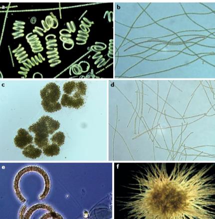 藍(lán)藻可形成致密的水華(圖1)。藍(lán)藻水華指主要由藍(lán)藻引起的水體顏色的明顯改變。常見導(dǎo)致水華形成的屬有絲囊藻、胞藻、長胞藻、微囊藻、節(jié)球藻、浮絲藻和束毛藻(圖2)。藍(lán)藻水華會導(dǎo)致嚴(yán)重的水質(zhì)問題,它們增大水的濁度從而導(dǎo)致水下植物窒息,微生物降解衰老死亡的水華消耗大量氧氣,導(dǎo)致魚類和底棲無脊椎動物因缺氧而死亡。藍(lán)藻會產(chǎn)生帶有異味的氣體混合物,干擾湖泊的娛樂功能和水庫儲蓄飲用水的功能。此外,藍(lán)藻水華還可以產(chǎn)生多種藻毒素,當(dāng)被鳥類、哺乳動物和人類攝入時會引起肝臟、消化和神經(jīng)系統(tǒng)的疾病。