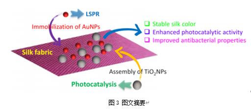 2NPs) 的復合涂層來增強絲織物的功能。通過原位合成將金納米粒子涂覆在絲織物上,然后在聚乙烯亞胺(PEI)的幫助下負載二氧化鈦納米粒子。 AuNPs通過其局部表面等離子體共振(LSPR)使真絲織物具有鮮艷的色彩,這種共振在TiO
