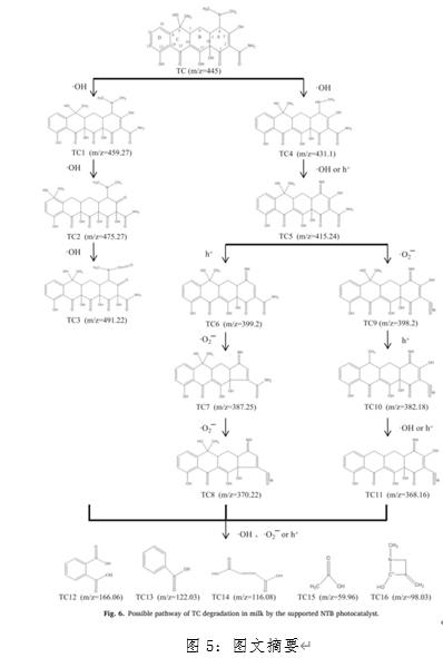 6 (NTB)三組分光催化劑。對光催化劑和光膜進(jìn)行了表征,并將其應(yīng)用于牛奶中四環(huán)素(TC)的降解及其對牛奶品質(zhì)的影響。結(jié)果表明,NTB光催化劑在可見光下表現(xiàn)出良好的光催化活性,其TC降解率分別比TiO