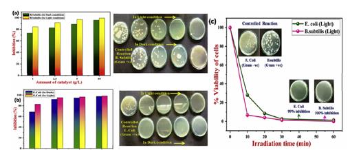 r1K新型光催化網(wǎng)_水庫(kù)治理_河道治理_水生態(tài)修復(fù)_水環(huán)境治理與修復(fù)_江蘇雙良環(huán)境科技有限公司圖1  不同光催化劑劑量對(duì)革蘭氏陽性菌—枯草芽孢桿菌(B. Subtilis)(a)和革蘭氏陰性菌—大腸桿菌(E. coli)(b)活性的抑制作用;光照催化時(shí)間對(duì)細(xì)胞活性的影響(c)。