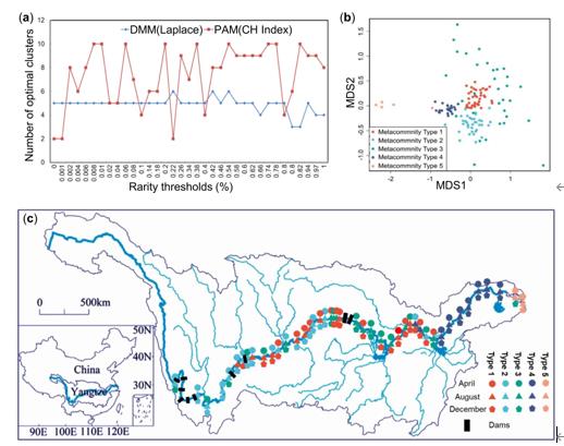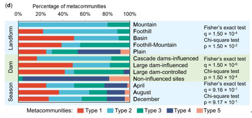圖6 沿江優(yōu)勢群落組成。(a)對不同閾值采用兩種常用的分割方法的穩(wěn)定性。最佳族群的數(shù)目由Calinski-Harabasz指數(shù)和拉普拉斯近似法表明。(b)非計量多維標(biāo)度(NMDS)圖顯示了用DMM方法劃分的5種不同亞群落類型之間的區(qū)別。(c)長江沿岸3個季節(jié)所有沉積物樣品的亞群落類型分布。(d)蒙特卡羅模擬的Fisher精確檢驗和Chisquare檢驗對群落類型與地貌類型、壩況類型和季節(jié)類型劃分之間的關(guān)聯(lián)性。Ka2新型光催化網(wǎng)_水庫治理_河道治理_水生態(tài)修復(fù)_水環(huán)境治理與修復(fù)_江蘇雙良環(huán)境科技有限公司