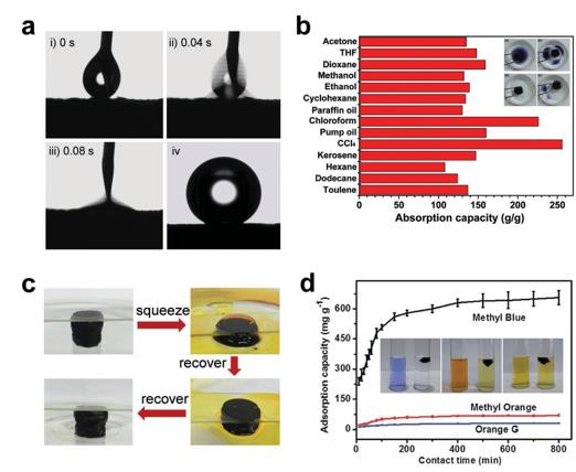 Ka2新型光催化網(wǎng)_水庫治理_河道治理_水生態(tài)修復(fù)_水環(huán)境治理與修復(fù)_江蘇雙良環(huán)境科技有限公司圖1  a)3D石墨烯氣凝膠作為吸附劑,用于從水中去除有機污染物。 a-i-aiii)一滴十六烷的吸收過程的視頻快照,以及a-iv)石墨烯氣凝膠表面上的水滴的光學(xué)照片。b)石墨烯氣凝膠對不同有機溶劑的吸收能力。 c)吸附/解吸循環(huán)顯示石墨烯氣凝膠對正己烷具有極好的可回收性。 d)不同染料的石墨烯氣凝膠的吸收能力。
