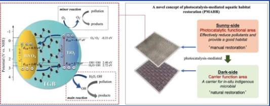 本文首次提出了光催化介導(dǎo)原位水生境修復(fù)(PMAHR)的新概念。設(shè)計(jì)了具有雙功能結(jié)構(gòu)的原位水生境修復(fù)織物器件。通過逐步提高水生生物棲息地的質(zhì)量,間接為水生生物創(chuàng)造良好的生存條件促進(jìn)其生長(zhǎng),從而提高水生生物多樣性。研究通過水熱方式合成了一種PMAHR材料TiO2 / Graphene / BiVO4 (TGB)。表征數(shù)據(jù)表明新材料的吸收波長(zhǎng)拓展至 504 nm。進(jìn)一步地,聯(lián)合團(tuán)隊(duì)設(shè)計(jì)了一種基于TGB材料和原位微生物分區(qū)固定化的雙功能結(jié)構(gòu)PMAHRM器件。器件向陽(yáng)面通過噴霧工藝涂布TGB材料,而背面則設(shè)計(jì)用于富集水中的原位微生物的功能。兩個(gè)部分通過特殊導(dǎo)線實(shí)現(xiàn)了連接。該器件在可見光下對(duì)RhB的去除率為 85.70 %。將該器件與輪葉狐尾藻( Myriophyllum verticillatum )相結(jié)合,在無錫某處黑臭水體進(jìn)行了為期近6個(gè)月的現(xiàn)場(chǎng)試驗(yàn)。結(jié)果表明,NH3-N、TP和COD濃度指標(biāo)降幅明顯,分別為 85.96 %、77.78 %和 73.53 %;透明指數(shù)上升 3.3 倍;底泥TN、TP和OM濃度指標(biāo)分別降低了 10.64 %、9.60 %和 34.08 %。生境質(zhì)量提進(jìn)而升產(chǎn)生了積極的生物效應(yīng)。其中,浮游生物和底棲動(dòng)物的Shannon-Wiener多樣性指數(shù)增加。藍(lán)藻門的密度下降了 57.33 %,綠藻門和硅藻門的出現(xiàn)使藻相趨于平衡。浮游動(dòng)物的平均密度增加了 5 倍。PMAHRM器件利用新型TGB納米復(fù)合材料,在水生境恢復(fù)中發(fā)揮了重要作用,有效促進(jìn)了水體生物多樣性的提升。