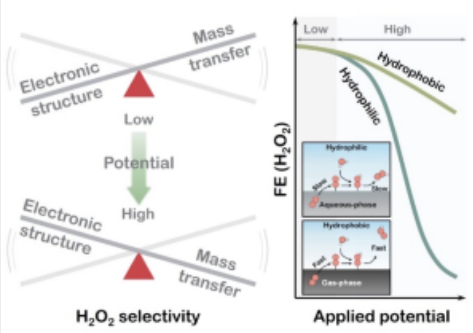 H2O2電合成工藝近年來取得了長足的進(jìn)步,一般認(rèn)為阻礙該技術(shù)工業(yè)化實施的關(guān)鍵瓶頸在于2e− ORR的耗氣特性與O2在水中固有的低溶解度間難以調(diào)和的矛盾。氣體擴(kuò)散電極(GDE)允許直接利用氣態(tài)原料并大大縮短氣體遞送距離被廣泛認(rèn)為是最適合2e− ORR的電極架構(gòu)平臺。特別是對于那些具有仿生呼吸設(shè)計的GDE,其無需耗能的曝氣設(shè)施的特點為進(jìn)一步推進(jìn)商業(yè)上可行的電解電堆鋪平了道路。因此,設(shè)計篩選先進(jìn)電催化劑將ORR選擇性引導(dǎo)至所需的2e−路徑,隨后將其集成至GDE用于體相電解已成為H2O2電合成領(lǐng)域一個突出的研究范式。然而始終令人困惑的是,電催化劑和組裝的GDE在體相電解過程中經(jīng)常表現(xiàn)出H2O2選擇性的巨大差異,這對電極材料的系統(tǒng)設(shè)計帶來了重大挑戰(zhàn)。該研究闡明了除電催化劑本征特性之外的關(guān)鍵物種(包括反應(yīng)物和產(chǎn)物)的傳質(zhì)行為在決定電極尺度H2O2選擇性方面的關(guān)鍵作用。這種規(guī)律在高反應(yīng)速率(電流密度)條件下由于傳輸限制的加劇將變的更加顯著。研究人員利用GDE的擴(kuò)散相關(guān)參數(shù)(即潤濕性和催化劑層厚度)作為探針因素,結(jié)合短期和長期電解以及原位電化學(xué)反射吸收成像和理論計算,系統(tǒng)研究了傳質(zhì)與傳質(zhì)行為控制的局部微環(huán)境對O2和H2O2輸運的影響。相應(yīng)地揭示了電極尺度上擴(kuò)散控制的轉(zhuǎn)化選擇性的機(jī)制起源。該研究強(qiáng)調(diào)了對主流疏水GDE進(jìn)行能夠同步優(yōu)化反應(yīng)物和產(chǎn)物的傳質(zhì)行為的架構(gòu)創(chuàng)新的必要性,為面向電合成的下一代GDE的研發(fā)指引了方向。