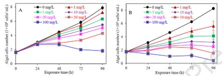 4對兩種藻類(銅綠微囊藻、普通小球藻)72小時的平均有效濃度分別為(56.4, 89.6 mg/L)和(12.5, 20.6 mg/L)。Cu-g-C