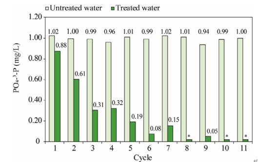 43-P/L·d。在滴濾反應(yīng)器上生長起來的氧化氫細(xì)菌生物量是由含1.25 %磷的干物質(zhì)上組成,這說明正磷酸鹽的去除原理是以氧化氫細(xì)菌生長為基礎(chǔ)的。用未經(jīng)處理和處理的水進(jìn)行藍(lán)藻生長實驗,結(jié)果表明集胞藻只能在未經(jīng)處理的水中生長。處理后的水,正磷酸鹽平均殘余值為0.008 mg/L。在這個試驗研究證明,氧化氫細(xì)菌能夠?qū)⑺械恼姿猁}去除到阻止藍(lán)藻生長的濃度。