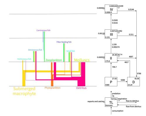 iyw新型光催化網(wǎng)_水庫治理_河道治理_水生態(tài)修復(fù)_水環(huán)境治理與修復(fù)_江蘇雙良環(huán)境科技有限公司  圖5:經(jīng)濟(jì)大同湖食物網(wǎng)的流程圖(左)和林德曼脊椎(右)。不同的顏色對應(yīng)不同的官能團(tuán),每條線段的粗細(xì)表示相對能量流,字體大小表示相對生物量。P:生產(chǎn)者;D:碎屑;TL:營養(yǎng)級;TST (%):系統(tǒng)總吞吐量(%);TE:轉(zhuǎn)移效率。