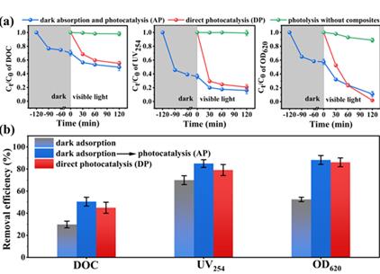 cTa新型光催化網(wǎng)_水庫治理_河道治理_水生態(tài)修復(fù)_水環(huán)境治理與修復(fù)_江蘇雙良環(huán)境科技有限公司(a) IOM在黑暗中的吸附和可見光下UV254和OD620光催化對DOC去除。黑線表示暗吸收和光催化(AP)。紅線表示直接光催化(DP),藍(lán)線表示不含復(fù)合物的光解結(jié)果已添加。(b)處理結(jié)束時的總體去除效率。(對于本圖例中的顏色參考,讀者可參考本文的web版本。)光催化是一種高效的高級氧化工藝,為控制湖泊或水庫中的藻華污染治理提供了一種很有前景的替代方法。以往的研究主要集中在光催化作用破壞藻類細(xì)胞上,而忽略了分泌物的釋放特別是細(xì)胞內(nèi)的有機(jī)物(IOM)。在此,通過固定相預(yù)光催化與新型Bi