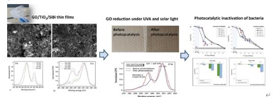 2/聚硅氧烷(SiBi)薄膜。通過(guò)掃描電子顯微鏡(SEM)、透射電子顯微鏡(TEM)、X射線光電子能譜(XPS)、紫外光電子能譜(UPS)、拉曼光譜和水接觸角測(cè)量對(duì)制備的涂層進(jìn)行了表征。在光催化試驗(yàn)中,觀察到用GO改性的所制備的涂層的顏色發(fā)生了強(qiáng)烈的變化。光催化試驗(yàn)后薄膜的XPS分析表明GO發(fā)生了還原。研究了制備的涂層在UVA和自然陽(yáng)光照射下對(duì)水產(chǎn)養(yǎng)殖水中自然產(chǎn)生的微生物的滅活作用。在UVA照射下,研究了所制備涂層中rGO濃度對(duì)靶菌嗜水氣單胞菌和吉列檸檬酸桿菌滅活的影響。與吉列檸檬酸桿菌相比,嗜水氣單胞菌對(duì)光催化滅活更敏感。rGO濃度為1%和5%的薄膜對(duì)目標(biāo)微生物有較高的光催化滅活作用。進(jìn)一步測(cè)試了rGO/TiO