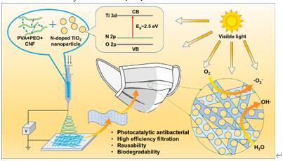 9Zm新型光催化網(wǎng)_水庫(kù)治理_河道治理_水生態(tài)修復(fù)_水環(huán)境治理與修復(fù)_江蘇雙良環(huán)境科技有限公司在災(zāi)難性的SARS-CoV-2(2019冠狀病毒疾?。┐罅餍衅陂g,美國(guó)疾病控制和預(yù)防中心強(qiáng)烈建議使用個(gè)人防護(hù)裝備(PPE)進(jìn)行自我保護(hù)。然而,個(gè)人防護(hù)用品的大規(guī)模使用在回收和消毒使用過(guò)的口罩方面遇到了重大挑戰(zhàn)。為了解決舊口罩的相關(guān)塑料污染問(wèn)題,在這項(xiàng)工作中,我們?cè)O(shè)計(jì)了一種可重復(fù)使用、可生物降解和抗菌的口罩。通過(guò)聚乙烯醇(PVA)、聚環(huán)氧乙烷(PEO)和纖維素納米纖維(CNF)的靜電紡絲,然后酯化和沉積氮摻雜的TiO