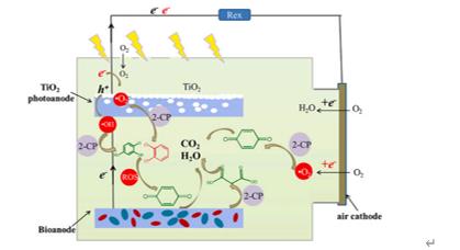 2(PMFC)。2-CP(5mg/l)在PMFC中的去除率為76.2% ,高于MFC (19.33%)和光催化(49.23%)。隨著溶解氧濃度的增加,電子-空穴分離效率降低,由于系統(tǒng)的電流密度降低,導(dǎo)致光催化效率低下。隨著光照強(qiáng)度的增加,模式產(chǎn)電菌地桿菌、PHOS-HE36 fam和假單胞菌屬的豐度增加,有助于提高發(fā)電量和2-CP的降解。1,2-二氯苯在PMFC中的唯一檢測(cè)中間體表明,微生物可以調(diào)節(jié)偶聯(lián)體系中2-CP的降解途徑。這些發(fā)現(xiàn)為光催化和微生物發(fā)電相結(jié)合的有效降解難降解有機(jī)物和同時(shí)回收能量提供了一種可行的方法。
