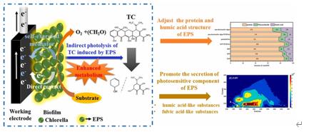 9Zm新型光催化網(wǎng)_水庫(kù)治理_河道治理_水生態(tài)修復(fù)_水環(huán)境治理與修復(fù)_江蘇雙良環(huán)境科技有限公司圖5  電刺激和抗生素誘導(dǎo)聯(lián)合產(chǎn)生微藻源光敏劑增強(qiáng)TC光解的圖式機(jī)制