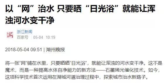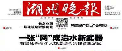 5月4日,湖州晚報發(fā)表名為《一張“網(wǎng)”成治水新武器,石墨烯光催化水環(huán)境綜合治理首現(xiàn)湖城》的報道,稱此次引進的石墨烯光催化技術(shù),是借助科學(xué)“武器”,不斷提高水體自凈能力,來實現(xiàn)科學(xué)治水的效果。CDg新型光催化網(wǎng)_水庫治理_河道治理_水生態(tài)修復(fù)_水環(huán)境治理與修復(fù)_江蘇雙良環(huán)境科技有限公司