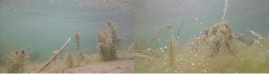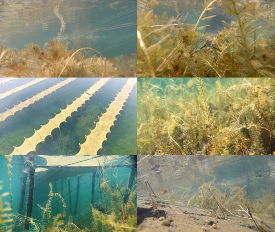 T1池:水下通透、自然生長的狐尾藻、蘿卜螺。Xis新型光催化網(wǎng)_水庫治理_河道治理_水生態(tài)修復(fù)_水環(huán)境治理與修復(fù)_江蘇雙良環(huán)境科技有限公司